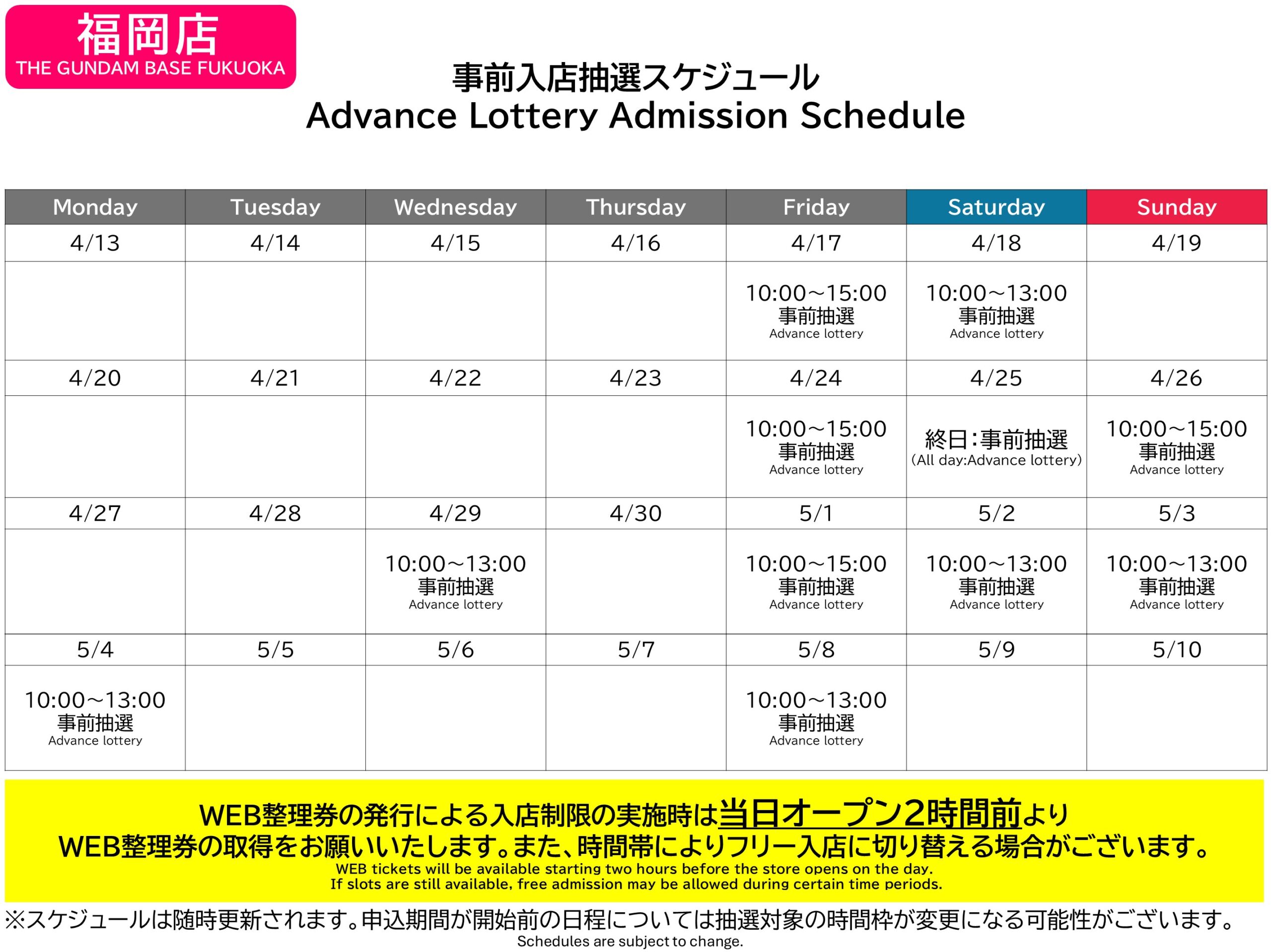 福岡店では安全配慮・混雑緩和のため日時によって事前抽選及びWEB整理券での運営を行っております。下記スケジュールおよび上記の営業状況をご確認の上、お申込みください。 ![]() 【2026年4月24日(金)・4月25日(土)・4月26日(日)のお申込み期間】 2026年4月13日(月)18:00~4月19日(日)23:59まで(予定) 【2026年4月29日(水)・5月1日(金)・5月2日(土)・5月3日(日)・5月4日(月)のお申込み期間】 2026年4月20日(月)18:00~4月26日(日)23:59まで(予定) 【2026年5月8日(金)のお申込み期間】 2026年4月27日(月)18:00~5月3日(日)23:59まで(予定) WEB整理券の取得 事前抽選の応募はこちら! ※お申し込みにはApple IDもしくはGoogleアカウントが必要です。 |