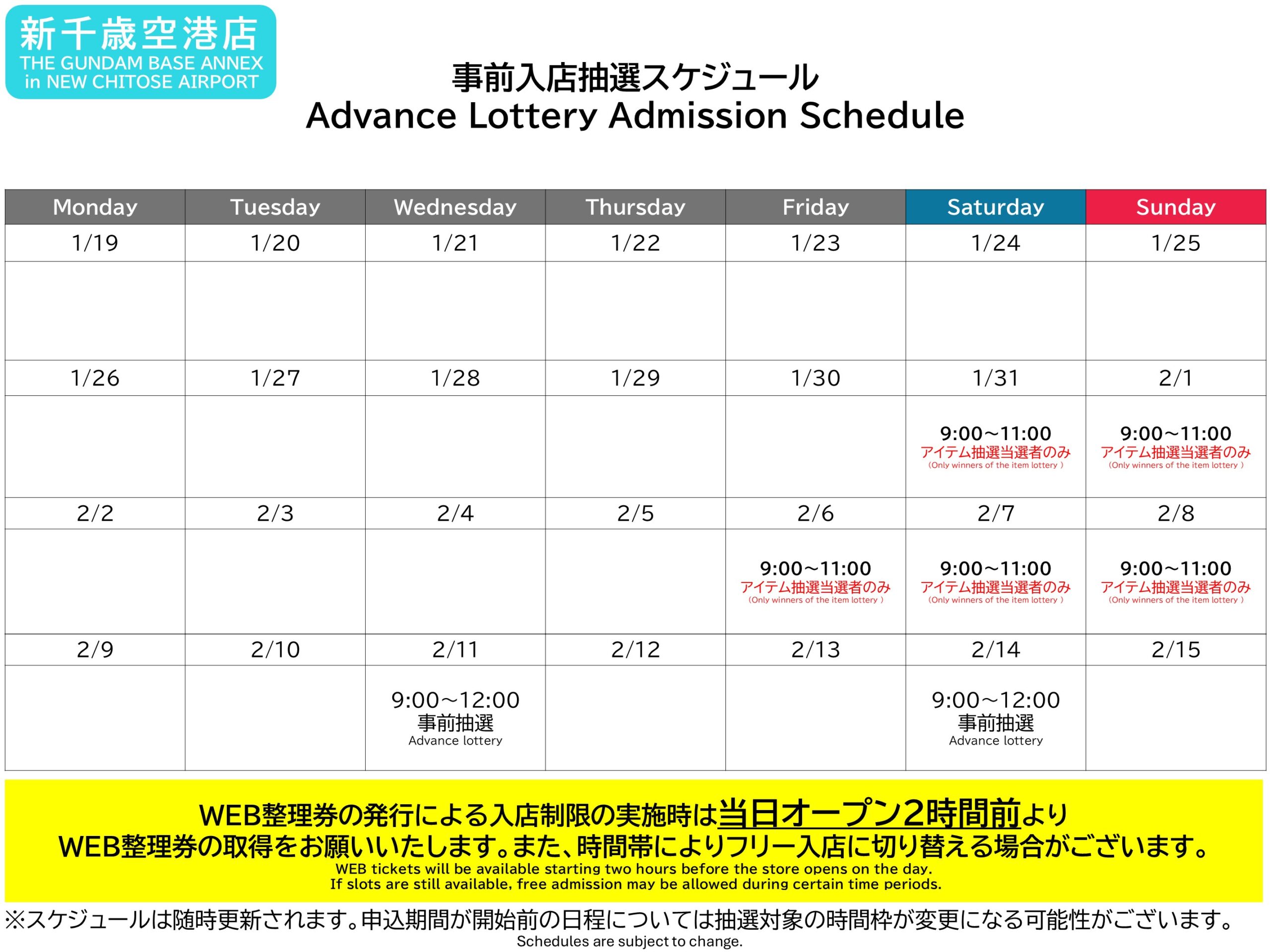 アネックス新千歳空港店では安全配慮・混雑緩和のため日時によって事前抽選及びWEB整理券での運営を行っております。下記スケジュールおよび上記の営業状況をご確認の上、お申込みください。