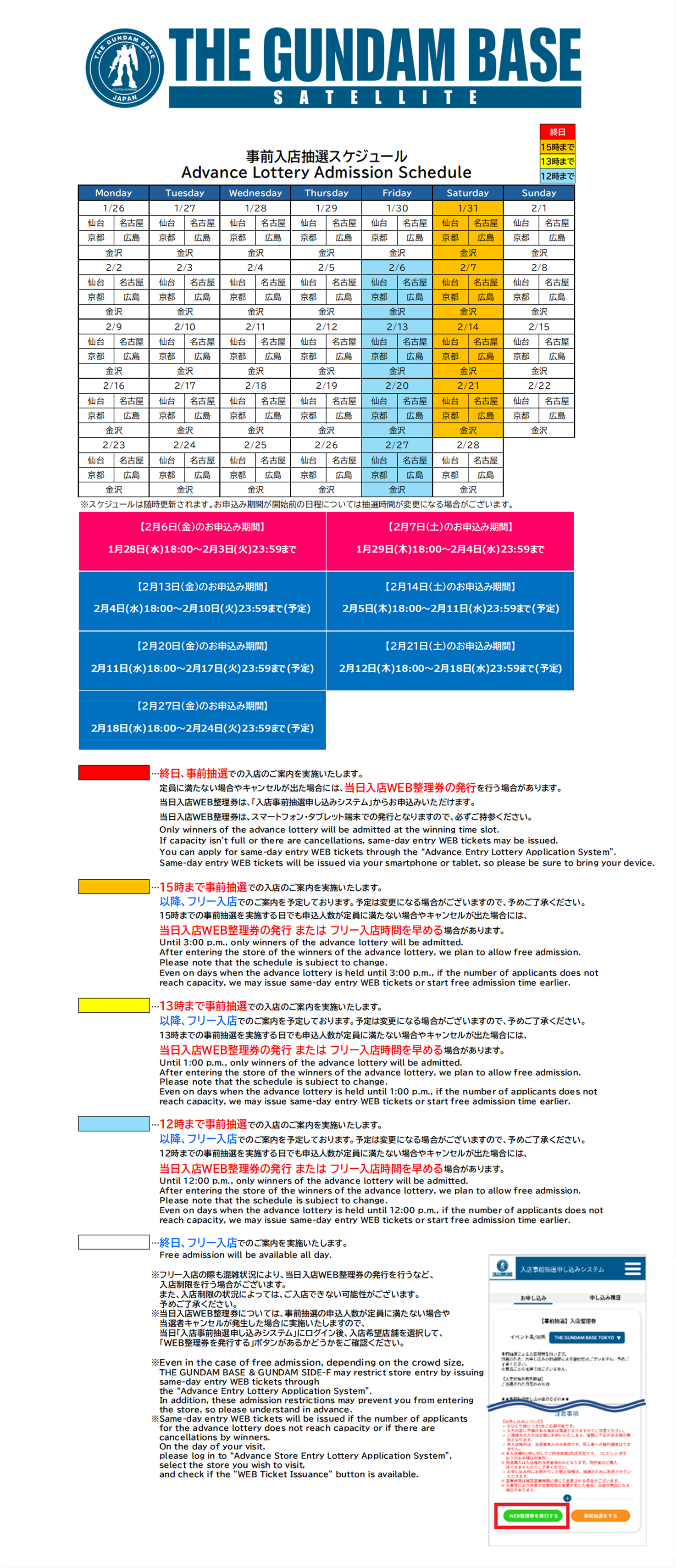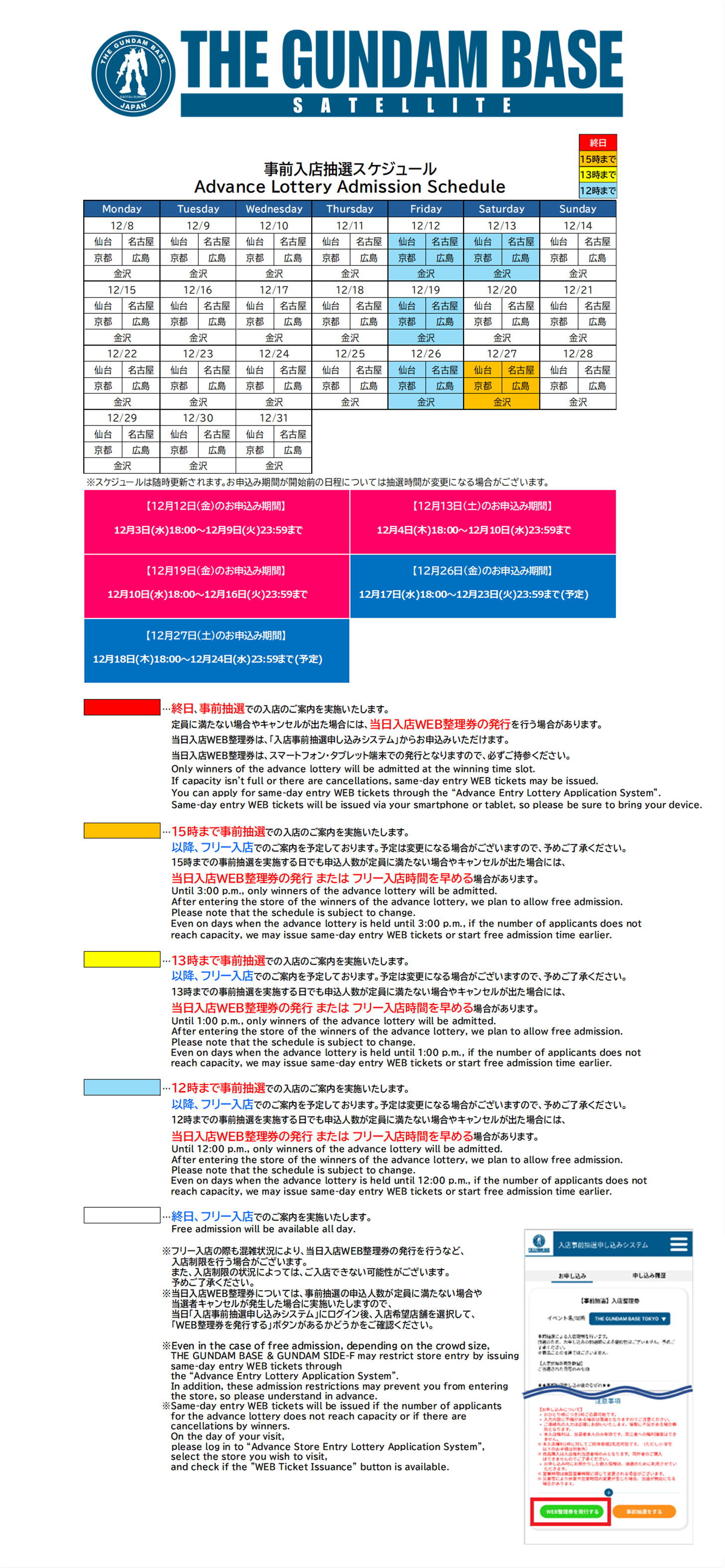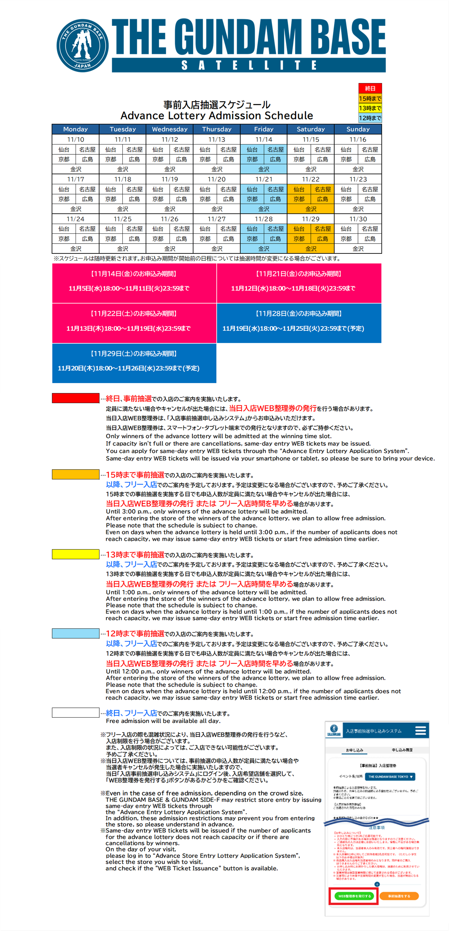 ※こちらはガンダムベースサテライト店の事前入店抽選のページです。抽選スケジュールは予告なく変更になる場合がございますので、お客様ご自身で「入店事前抽選申し込みシステム」にログインしていただき、抽選対象日程をご確認ください。