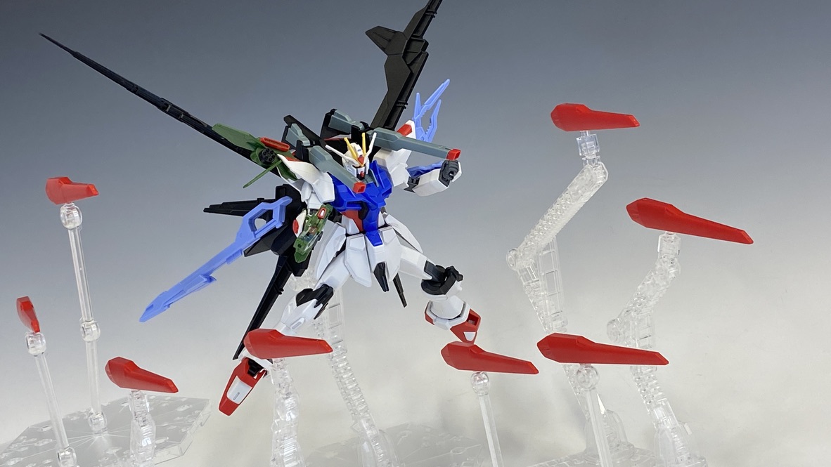 ストライクフリーダムガンダムにパーフェクトストライクガンダムの意匠が見事に溶け込んだデザインです。