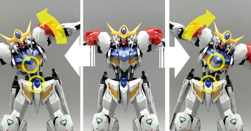 ■ガンダム・フレームは肩関節のアップデートに加え、新たに腰部の前後傾の可動域が向上し、更にしなやかなポージングが可能に。
