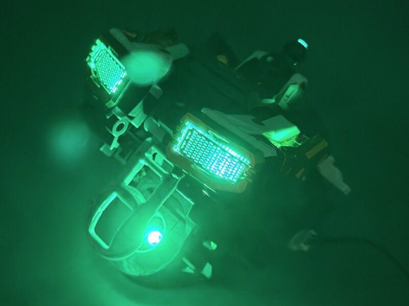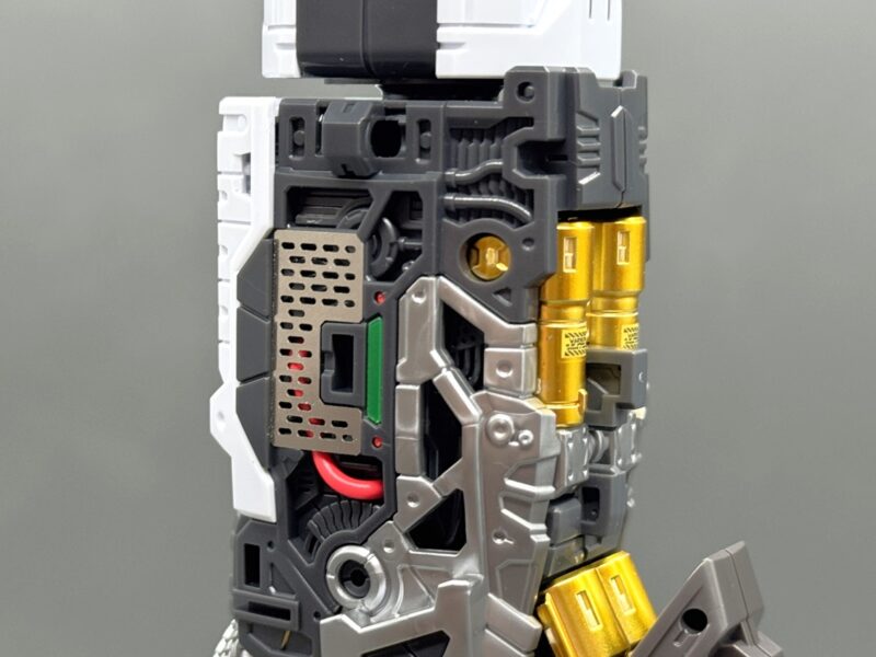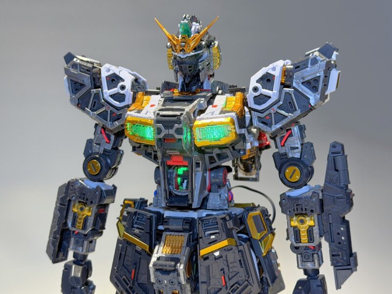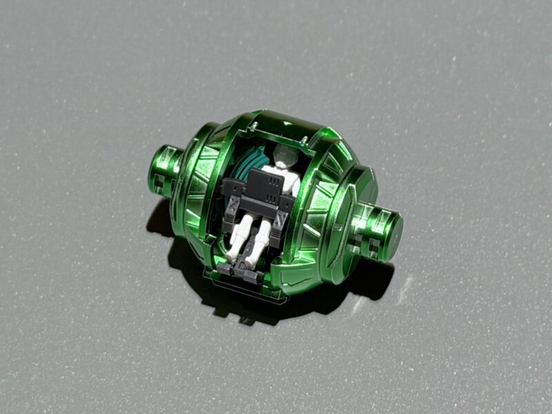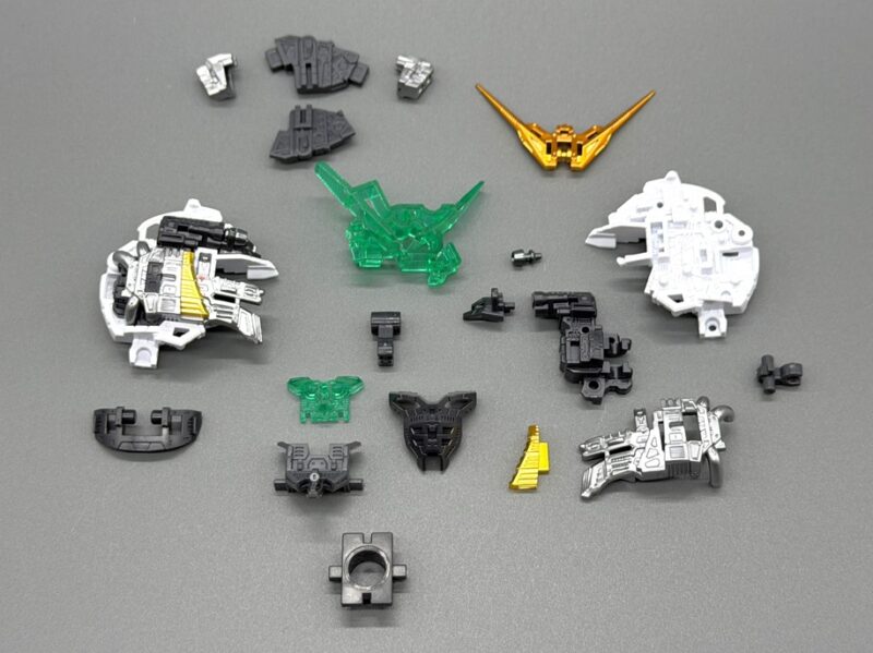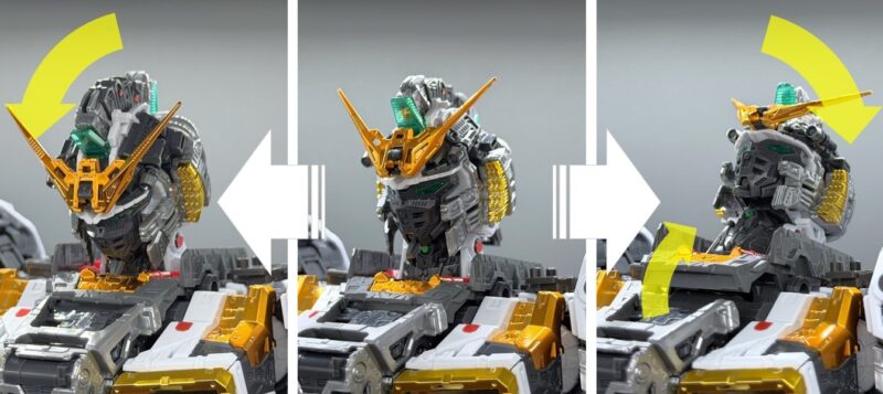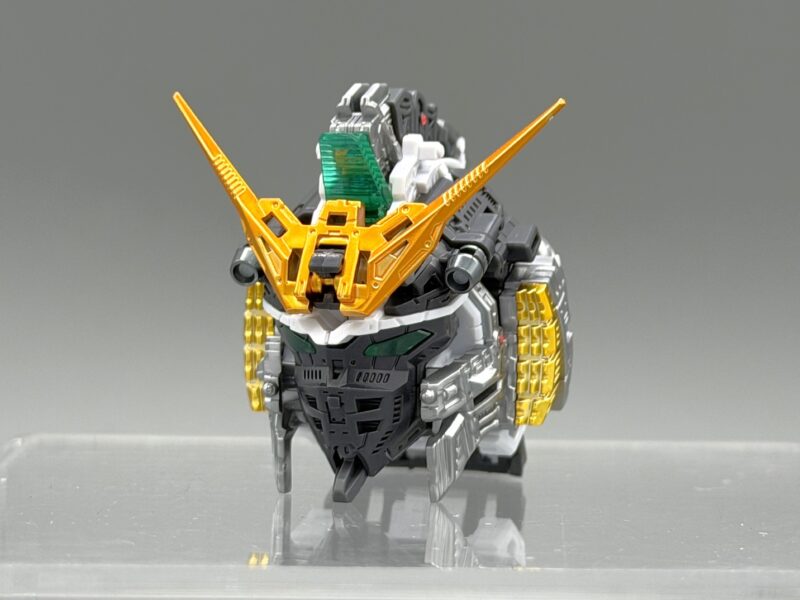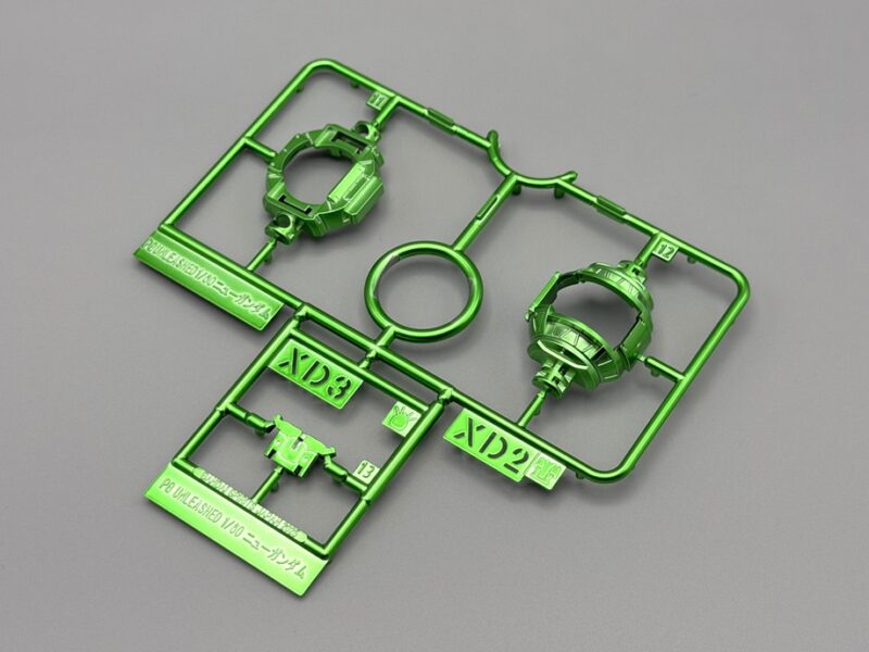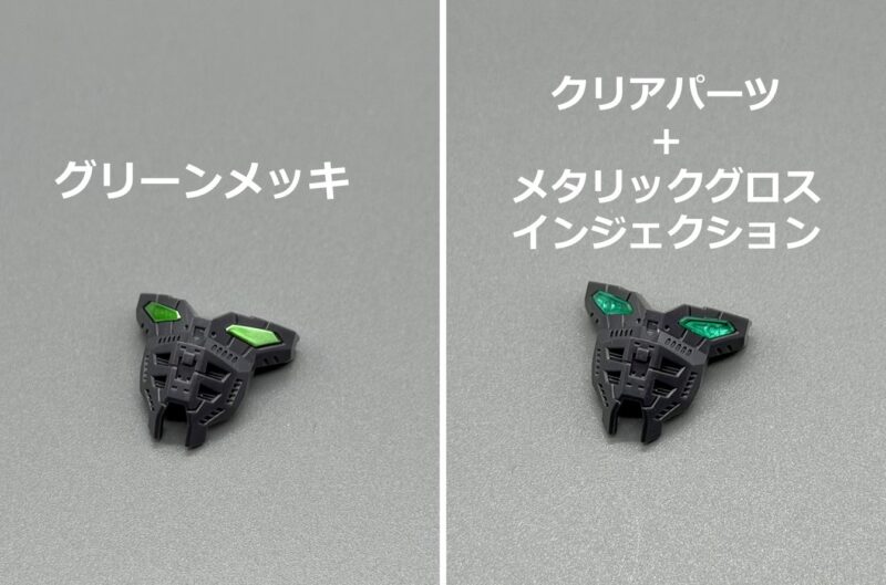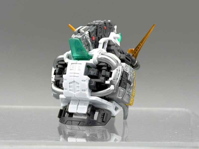 頭部ツインアイ(非発光用)やコクピット・ブロックにはグリーンメッキが採用されています。