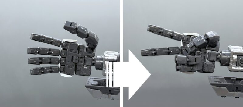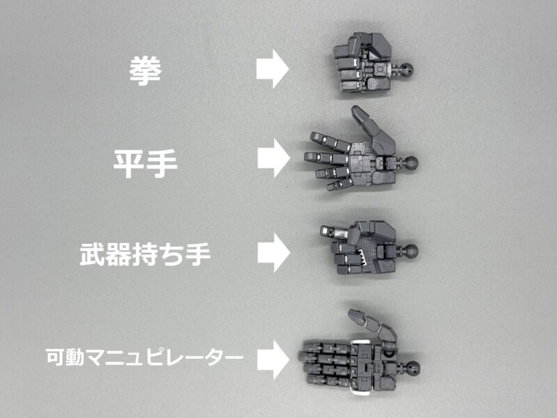 ハンドパーツは拳、平手、持ち手、そして各関節が可動するマニュピレーターが付属します。