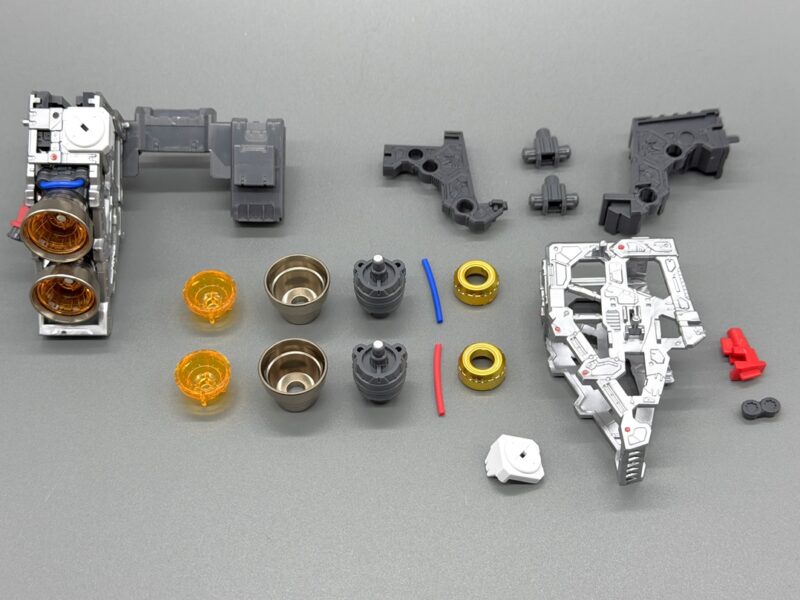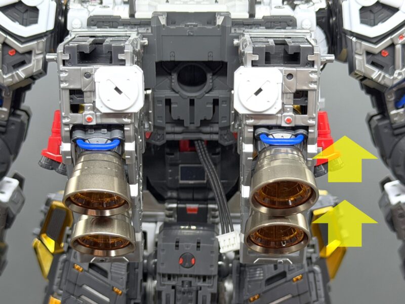 ■メインスラスターのノズルや頭部バルカンの発射口には金属パーツを使用。