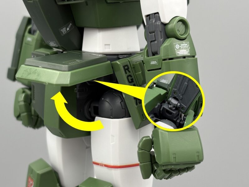 肩の可動域は、多軸構造により大きく可動し一部パーツが開閉することにより