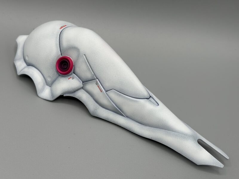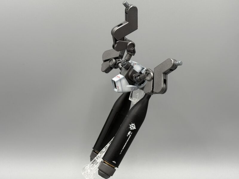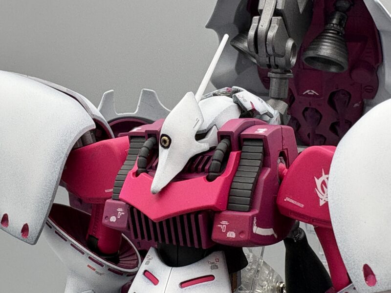 大型MAの重厚感を表現するため、GSIクレオス「Mr.サーフェイサー500 スプレー」で塗装した上に「ガンダムカラーUG01 MSホワイト」「Mr.カラーGX クールホワイト」を吹きつけグラデーション塗装で陰影をつけています。