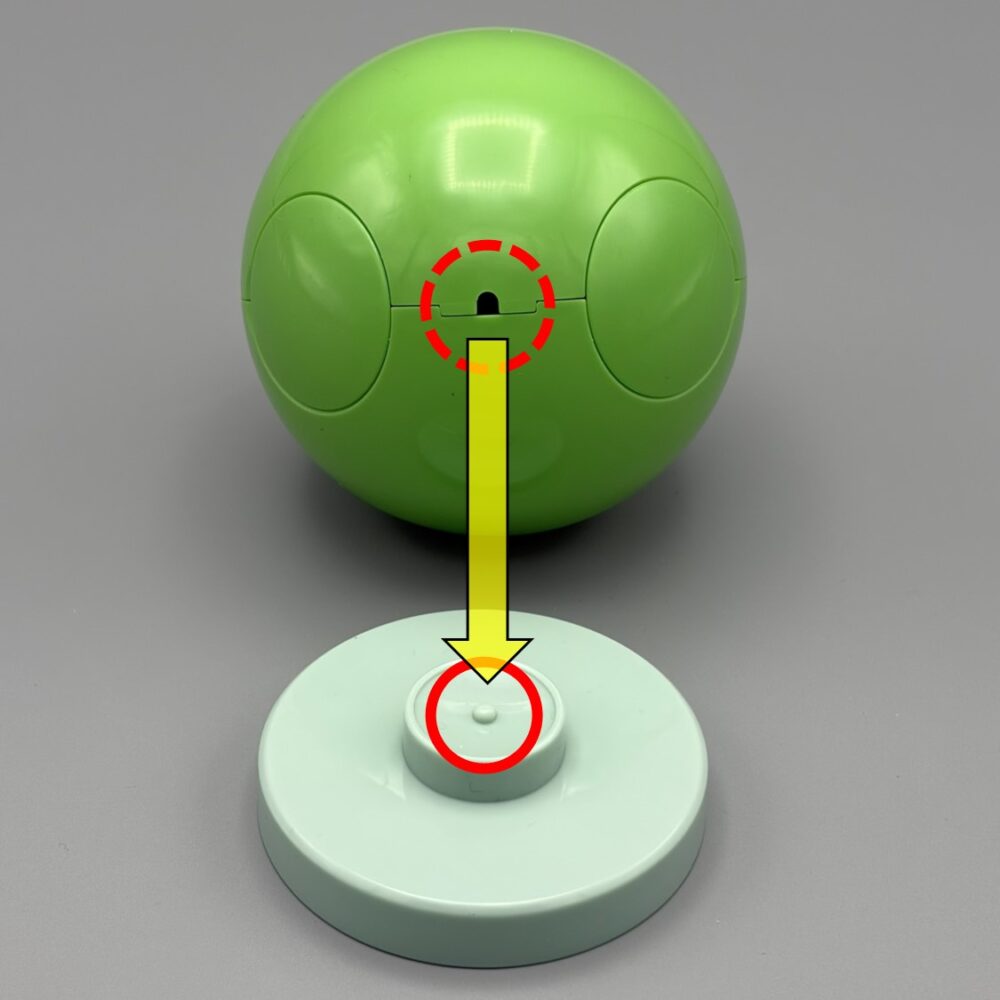 本体の底に穴があり、台座に挿し展示します。台座の上で安定させることが可能です。
